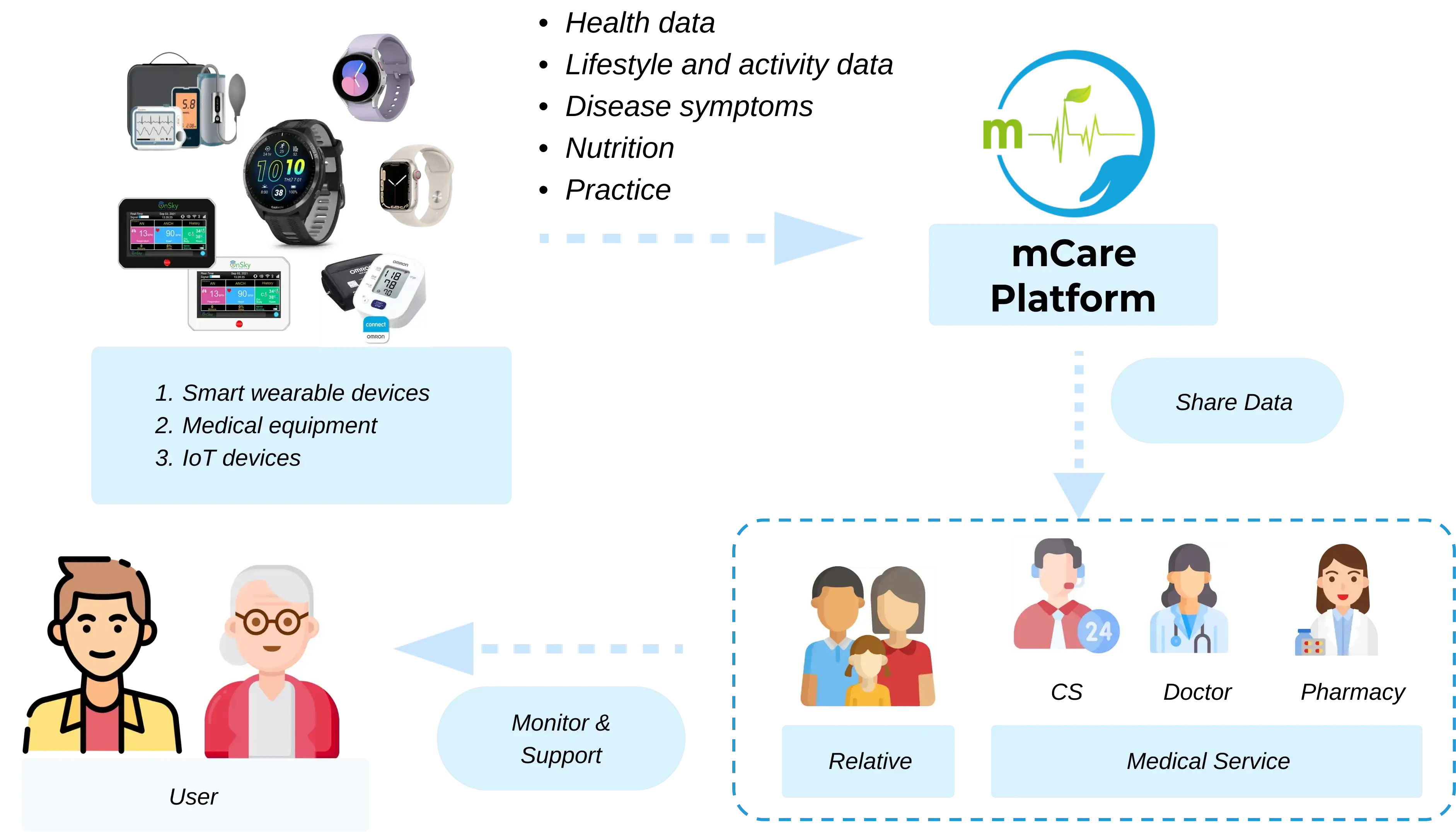 Solution for health data collection 24/7 to monitor, send warnings and provide timely support. Help partner improve process quality and expand new services.